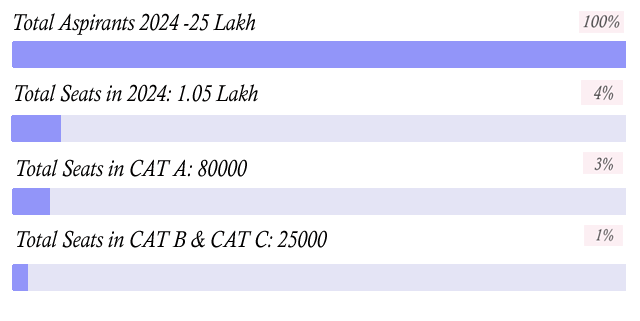 The probability of a student obtaining a seat in India is below 4%, taking into account the 27% reservations for affluent individuals in Category B and Category C seats.